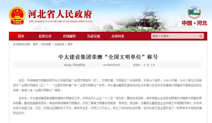 河北省人民政府網(wǎng)站報(bào)道了中太建設(shè)集團(tuán)榮膺“全國(guó)文明單位”稱號(hào)