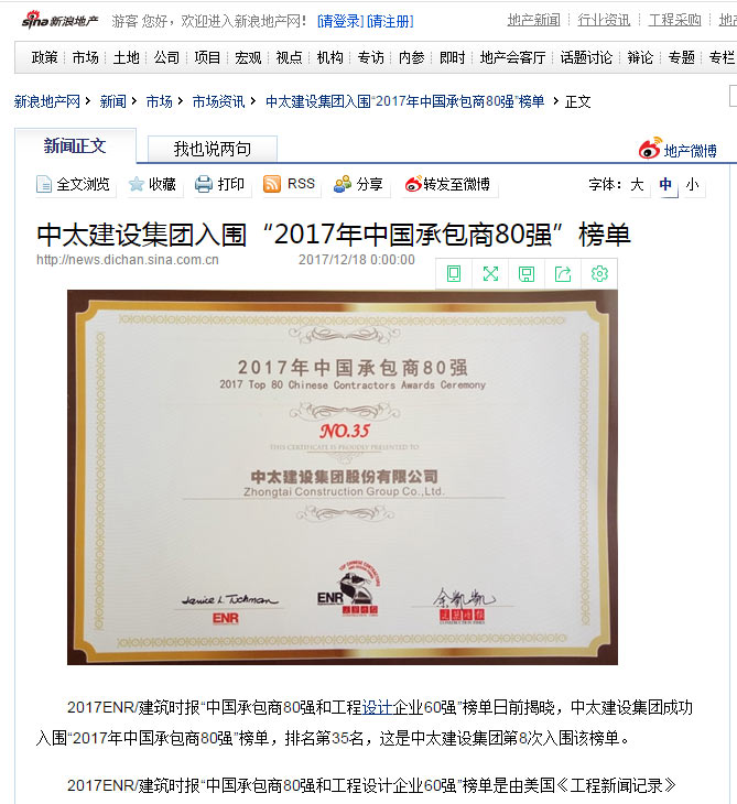 新浪網(wǎng)報(bào)道了“中太建設(shè)集團(tuán)入圍“2017年中國(guó)承包商80強(qiáng)”榜單”
