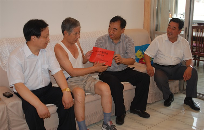 在八一建軍節(jié)到臨之際,7月27日上午,廊坊市人大副主任、市總工會主席王瑞峰(右二)、廊坊市總工會黨組書記、常務(wù)副主席關(guān)景發(fā)(右一),市總工會副主席王泰山在廊坊市建設(shè)局黨委委員、系統(tǒng)工會主任王克峰等領(lǐng)導(dǎo)同志的陪同下,來到集團(tuán)公司第一生活區(qū)家屬院,看望慰問公司因病家庭困難的軍轉(zhuǎn)干部劉國清(左二),代表市總工會向劉國清表示節(jié)日慰問,并頒發(fā)了慰問金。中太建設(shè)集團(tuán)黨委書記、董事局主席李文。ㄗ笠唬┡阃繂。 |