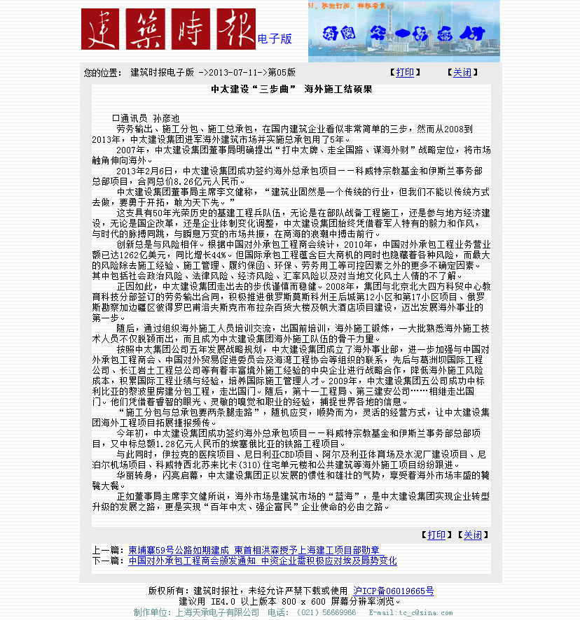 《建筑時報》7月11日第五版報道了中太建設集團進軍海外市場結碩果